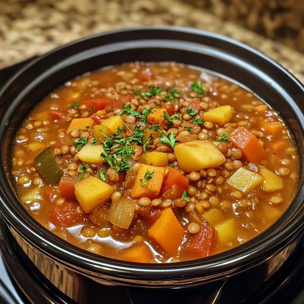 Picture this: a pot of fragrant steam rises, carrying the earthy scent of lentils mingling with the bright, sweet aroma of diced tomatoes and fresh herbs. The sound of the crockpot’s gentle hiss feels like a lullaby, and the sight of the vegetables turning a golden hue signals that everything is coming together. When you take that first spoonful, the lentils are tender but still hold their shape, the carrots are crisp, and the spinach adds a splash of green that feels like a breath of fresh air. The broth is thick enough to coat the spoon like velvet, yet light enough to sip directly from the pot. You can almost taste the subtle kick of cumin and paprika dancing on your tongue.