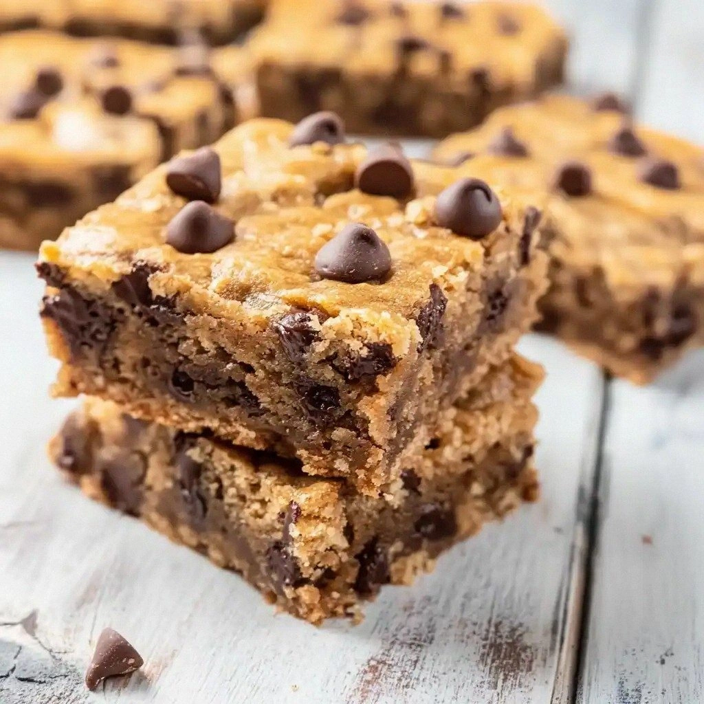**Texture Contrast:** The batter’s consistency is thick enough to hold its shape yet light enough to melt in your mouth. The sprinkled chocolate chips on top add a satisfying crunch that breaks the soft interior, giving the bars a delightful textural interplay.