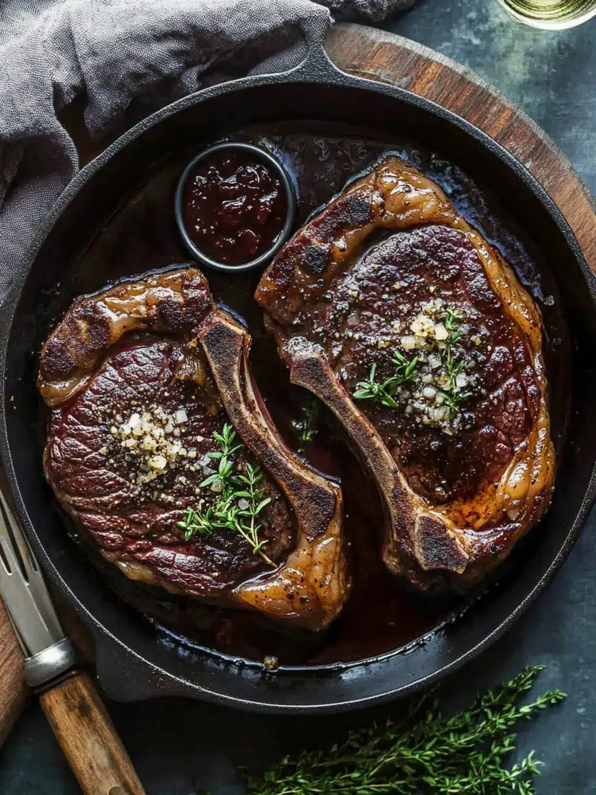 Picture the scene: a heavy cast‑iron skillet, the clink of a metal spoon, the sharp scent of garlic and shallots dancing in the air. The steak itself, thick and glossy, is waiting to meet its destiny. I hear the sizzle, the sound of fat rendering, the crackle that signals the crust is forming. The aroma is a complex symphony—rosemary, thyme, and a hint of red wine that promises depth. I feel the heat radiating from the pan, the comforting weight of a steak that’s about to become the centerpiece of a dinner that will feel like a celebration.